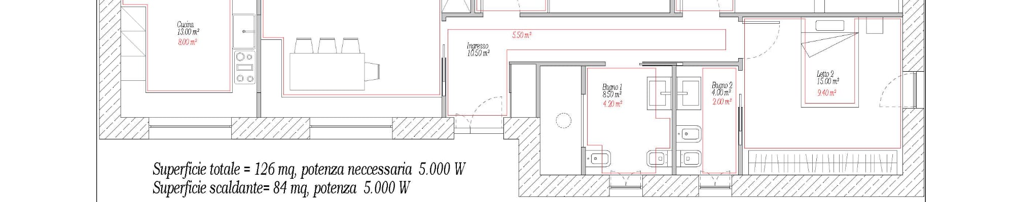 Per esempio: per una casa con 126 mq in totale, con un fabbisogno termico di 5.000W si può installare il riscaldamento a pavimento solo su 84 mq con una potenza totale 5.000W.